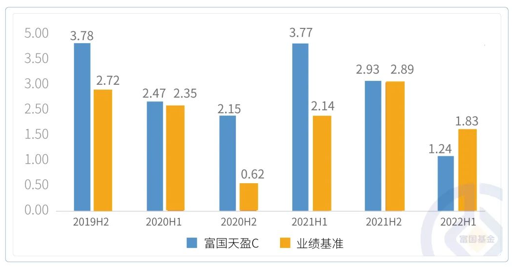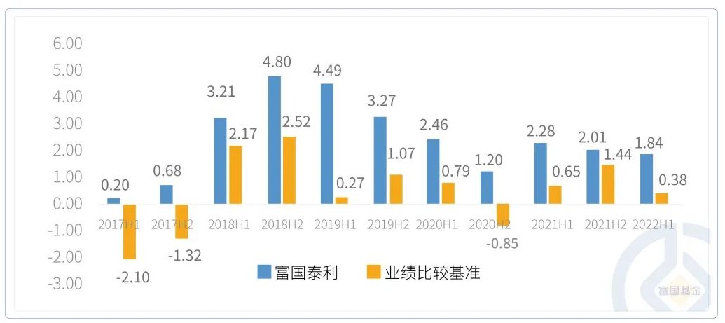 纯债型基金以富国泰利为例,俞晓斌自2016年12月开始管理此产品,至今11个半年度均取得了正收益,而同期业绩比较基准则出现数次较大幅度回撤。