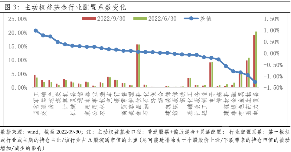 行业配置方面,从存量角度看,电力设备、食品饮料、医药、电子和有色金属是主动权益基金持股市值最多的5个行业。从边际变化看,三季度基金主要加配行业是国防军工、交运、地产、煤炭和计算机;主要减配行业为电力设备、医药、有色金属、非银金融和建筑材料。