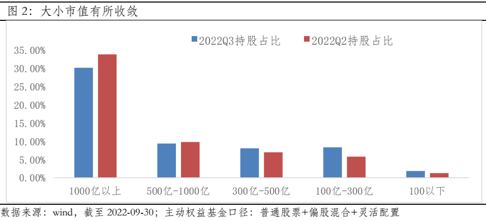 (2)大小市值进一步收敛,估值进一步下沉,当然市场本身的下跌也会带来一部分变化:重仓股中,500亿市值以上的持股占比由2季度的43.63%降至39.53%,而300亿市值以下的持股占比由2季度的7.06%上升至10.16%。估值层面,50倍PE(TTM)以上持股占比由2季度的43.7%降至34.4%。市值下沉和估值收缩的背后,与市场本身处于下跌的状态相关,但或也体现了在当前的市场环境下,对于一些细分赛道上的小公司机会的挖掘以及估值安全性的考量提升;