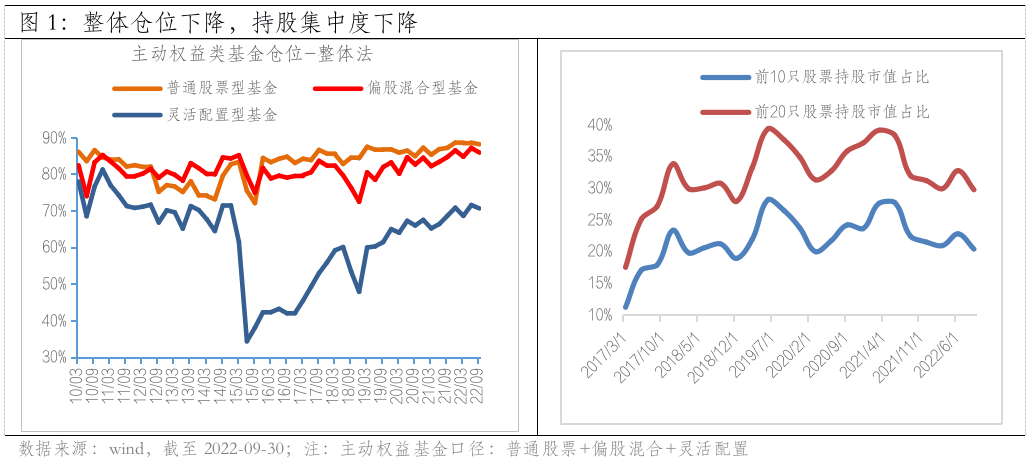 (1)主动权益类基金仓位有所调降,持股集中度下降:普通股票、偏股混合、灵活配置型基金仓位分别从2季度的88.7%、87.2%、71.6%调降至88.2%、85.9%、70.7%。前20只股票的持股市值占比从2季度33%调降至30%;