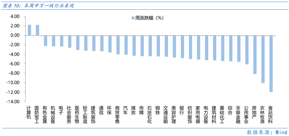 近一周,上证指数下跌4.05%,创业板指下跌6.04%,沪深300下跌5.39%,中证500下跌2.94%,科创50上涨2.66%。风格上,成长、稳定表现相对较好,消费、金融表现较差。从申万一级行业看,表现相对靠前的是计算机(2.25%)、国防军工(2.23%)、有色金属(-2.22%)、机械设备(-2.3%)、电子(-2.32%);表现相对靠后的是食品饮料(-11.97%)、农林牧渔(-10.07%)、房地产(-8.16%)、公用事业(-6.11%)、非银金融(-5.58%)。