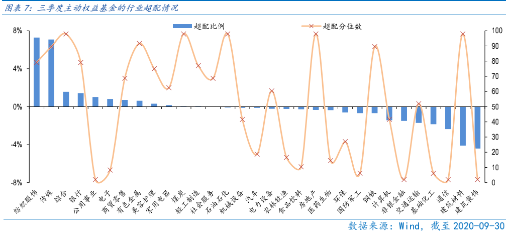 从超配比例看,主动权益基金对纺织服装、传媒、综合等行业超配明显,而二季度主动权益基金集中超配的电力设备、食品饮料、医药生物等行业超配比例大幅下降,显示随着以上行业股价的回调,其超配比例也有大幅的回落。前期主动权益基金集中配置热门行业的情况大幅好转,超配比例下降。一方面显示公募基金对行业减仓空间变小,或预示行业下跌空间有限,另一方面若未来行业基本面触底反转后,公募基金加仓亦有空间。