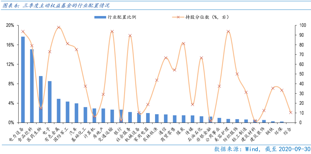 基金三季报披露完毕,显示主动权益基金(股票型+偏股混合型+灵活配置型)对电力设备(17.67%)、食品饮料(15.08%)和医药生物(9.58%)配置比例居前。