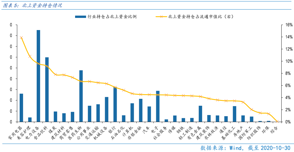 在紧缩的大背景下,北上资金短暂减持A股,7月5日至今净卖出超700亿元,向前看,海外紧缩的趋势大概率延续,北上资金的流出压力或仍是A股未来一段时间的掣肘。截至10月30日,行业持仓占北上资金整体持仓比例较高的是电力设备(17.02%)、食品饮料(11.97%)和医药生物(9.57%),而从更直接反映北上资金卖出冲击力的北上资金持仓占流通市值比来看,家用电器(13.90%)、美容护理(10.80%)、电力设备(9.61%)和食品饮料(9.18%)占比较高,短期或受北上资金流出压力压制明显。