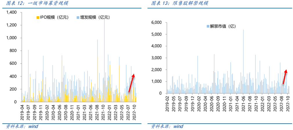 资金需求方面,本周一级市场规模有所减少,限售股解禁压力上行,重要股东减持。本周一级市场资金募集金额合计140.89亿元,较上周减少43.50%;结构上,IPO募集86.12亿元,周环比增加32.33%;增发募集54.77亿,周环比减少70.28%。本周限售股解禁规模合计598.24亿元,周环比减少6.06%,根据目前披露的数据,预计下周解禁规模约416.75亿元,解禁压力有所上行。本周重要股东减持27.16亿元,上周增持7.03亿元。
