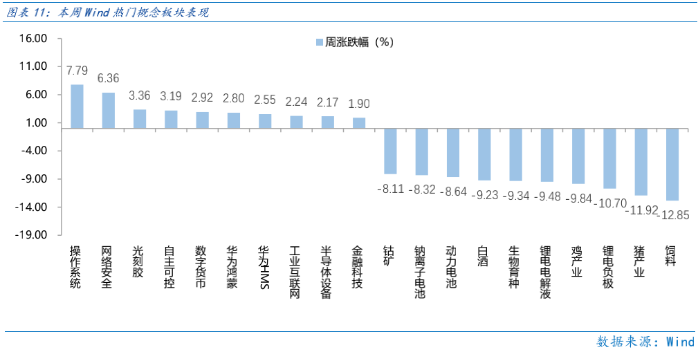 “安全”主题下的信创、半导体、军工等行业近期均有表现。从Wind热门概念板块来看,表现相对靠前的是操作系统(7.79%)、网络安全(6.36%)、光刻胶(3.36%)、自主可控(3.19%)、数字货币(2.92%);表现相对靠后的是饲料(-12.85%)、猪产业(-11.92%)、锂电负极(-10.7%)、鸡产业(-9.84%)、锂电电解液(-9.48%)。