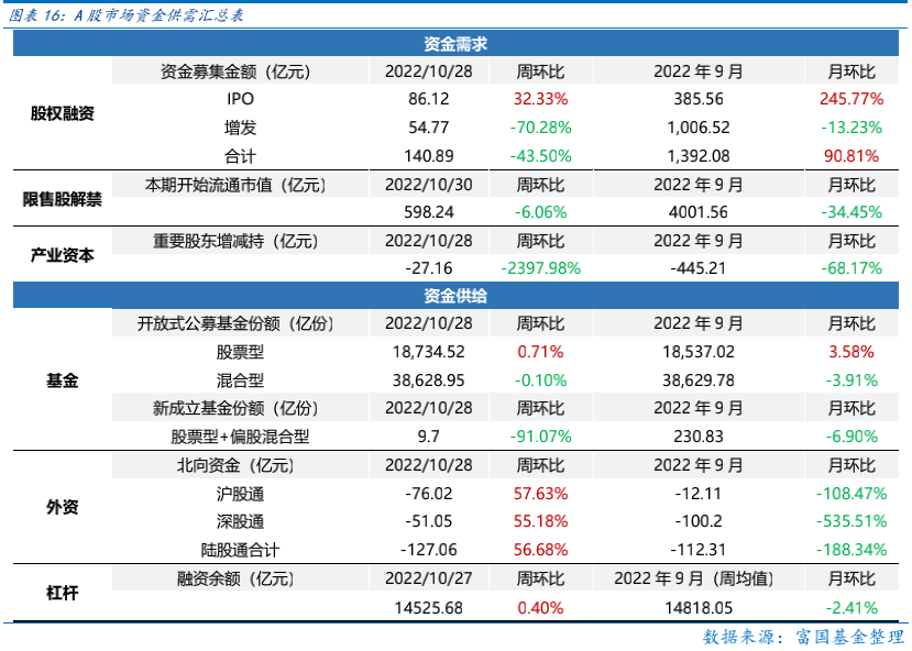 资金供给方面,本周基金发行减少,北向资金净增加。本周北向资金净流出127.06亿元,较上周减少56.68%,其中沪股通净流出76.02亿元,深股通净流出51.05亿元。本周新成立股票型及偏股混合型基金份额合计9.7亿份,环比减少91.07%,显示基金发行遇冷。本周开放式公募基金份额较稳定,其中股票型份额几乎保持不变为18734.52亿份,混合型份额几乎保持不变为38628.95亿份。