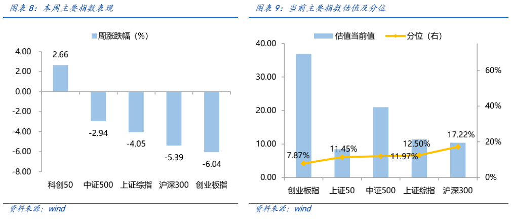 本周指数全线下跌。按风格来看,成长、稳定跌幅较小。当前A股仍然没有脱离偏悲观的情绪主导,市场仍在底部区域,或反复磨底。目前市场情绪依旧低迷,短期在悲观情绪主导下,市场在底部区域的快跌都会为短期的“深V”创造空间。