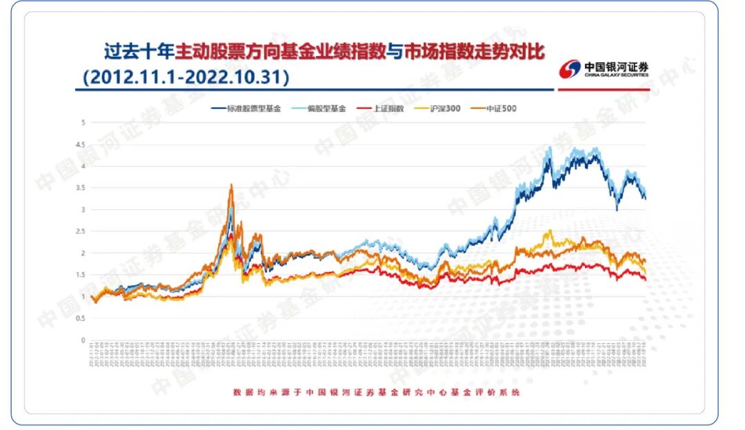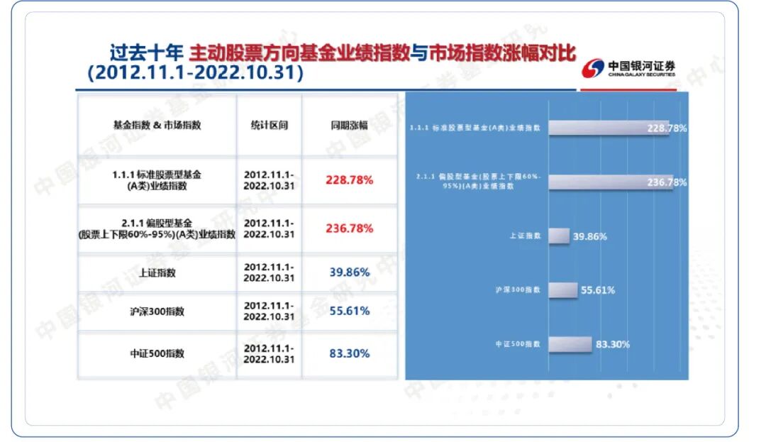 注:数据来自银河证券,指数历史收益情况不预示其未来表现。 2012年11月1日至2022年10月31日,同期标准股票型基金业绩指数与偏股型基金业绩指数的涨幅分别为228.78%、236.78%,上证指数、沪深300指数的涨幅分别为39.85%、55.61%。