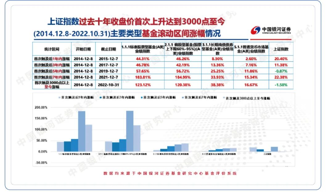 从过去十年收盘价首次上升到3000点至今,各类基金滚动涨幅情况来看,首次触及后1年内包括股票型、偏股型、债券型都获得了不错的表现,其中,偏股型基金和股票型基金的收益率涨幅都达到了44%以上,长期持有如首次触及后7年内的涨幅,股票型基金业绩指数和偏股型基金业绩指数涨幅都超过了180% ,同期上证指数的收益率为22.38%。