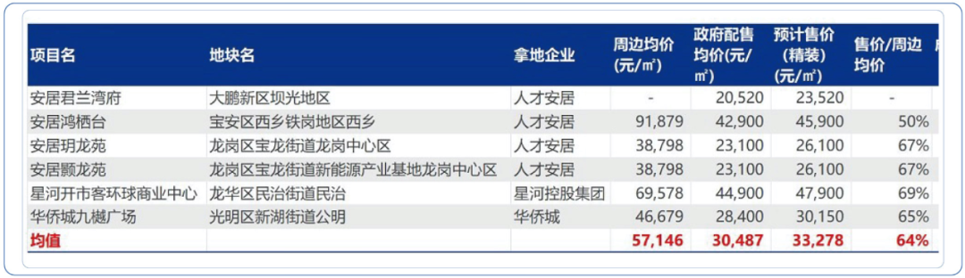 注:数据综合自深圳市房地产信息平台,截至2022年10月底 据了解,本次推出的6个项目,其中四个拿地企业都是深圳人才安居集团。它的运作方式通过投资建设、项目回购、合作开发、长期租赁等方式多渠道筹集建设人才安居住房房源。从上图可以发现,6个项目的售价与周边均价相比,都有不同程度的打折,幅度在50%——69%,均值为64%。直接较商品房价格打六折,意味着房价永不歇的时代谢幕,居民长期资产配置从房地产走向股权大时代的积极前进。