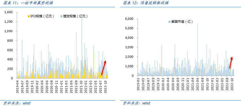 资金需求方面,本周一级市场规模有所减少,限售股解禁压力下行,重要股东减持。本周一级市场资金募集金额合计153.26亿元,较上周增加48.65%;结构上,IPO募集89.66亿元,周环比增加36.68% ;增发募集63.60亿,周环比增加69.59% 。本周限售股解禁规模合计699.58亿元,周环比减少6.03% ,根据目前披露的数据,预计下周解禁规模约1326.46亿元,解禁压力有所上行。本周重要股东减持88.57亿元,上周减持66.33亿元。