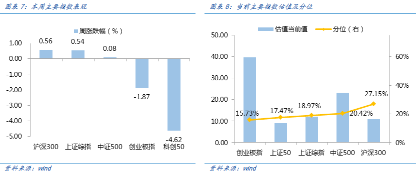 本周指数有所分化。按风格来看,金融、稳定表现较好。在上周大幅上涨后,资金风险偏好降低,市场仍在通过震荡消化获利盘。上周上证指数上涨5.31%,创业板指上涨8.92%,沪深300上涨6.38%,中证500上涨6.08%,科创50上涨7.96%,主要指数均表现强势。短期大涨后,资金追高意愿有限,明显向低位行业切换。