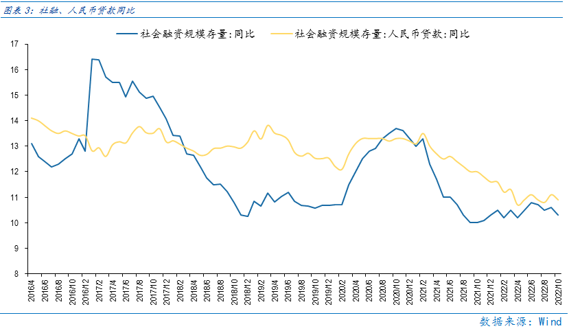 10月社融低于预期,与10月PMI共同指向10月经济运行偏弱,但短期央行“第二支箭”政策接力,市场对11月新增社融规模回升更为期待。10 月社融新增9079 亿元,低于16500 亿元的预期,同比少增7097 亿元。存量社融增速10.3%,较上月回落0.3pct。社融口径下的新增人民币贷款4431 亿元,同比少增3321 亿元,再次下滑。其中企业贷款的需求稍弱,企业中长期贷款同比多增2433 亿元,上月为6540 亿元。而住户贷款下降明显,是社融主要的拖累项,同比少增4827 亿元,居民对地产信心不足的背景下,加杠杆意愿回落。