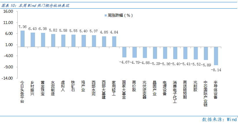 市场偏弱,如“元宇宙”等主题性机会明显。上周五部门联合印发《虚拟现实与行业应用融合发展行动计划(2022—2026年)》的通知。文中指出,虚拟现实产业发展战略窗口期已然形成,政策支持推动“元宇宙”主题投资走强,对VR的硬件设备及传媒行业形成推动。从Wind热门概念板块来看,表现相对靠前的是今日头条平台(7.36%)、乡村振兴(6.43%)、黄金珠宝(6.38%)、水泥制造(5.82%)、虚拟人(5.58%);表现相对靠后的是半导体设备(-8.14%)、中芯国际产业链(-5.89%)、光刻胶(-5.52%)、高送转预期(-5.41%)、消费电子代工(-5.4%)。