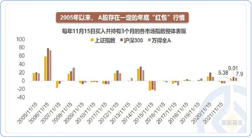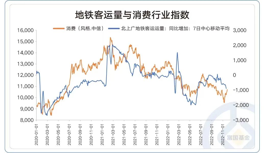 数据来自:Wind,截至2022-09-30;注:表内数据为对应行业中实现10倍、5倍、3倍、2倍以上回报的个股数量;统计范围不包括北交所。 目前消费的困局或在于,消费场景的缺失、消费能力的下降、消费信心的不足等; 而破局之道在于修复消费场景、增加灵活就业、加大促消费力度,释放居民的储蓄 。 富二做了一个有意思的统计,11月以来北上广地铁客运量平均较去年同期下滑700万人。 北上广的地铁客运量不仅反映本地居民的出行,也一定程度代表了全国三大经济圈商务往来的活跃程度 ,一定意义上,这三大城市地铁客运情况,可以反映生产和商务的基本情况,更是消费板块投资的前瞻指标,当下更是观察防疫20条实施后商务往来和生产生活的修复进度。 数据来源:Wind,统计区间20200101-20221115。 伴随着防疫措施的优化,消费者信心有望逐步改善 ,这将成为可选消费和场景消费复苏较大弹性的源泉, 最大程度减少经济发展的影响,激发消费活力 。例如2021年前7个月,疫情扰动得到一定控制后,经济蓬勃发展带来消费恢复。 A股整体上表现出一定的年底“红包”行情。 2005年以来,如果自11月15日买入并持有三个月,上证指数、沪深300、万得全A指数的三个月收益均值分别为5.38%、9.01%、7.90%。