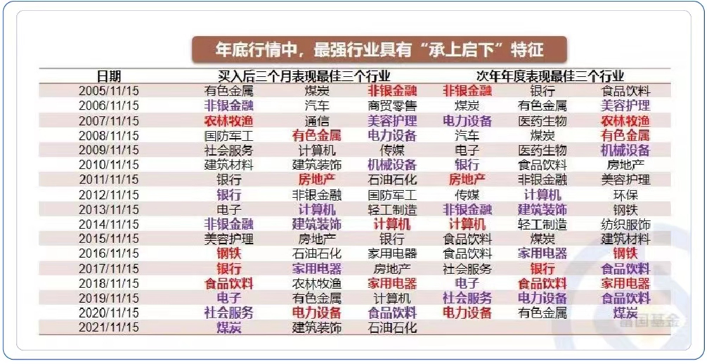 年底行情中表现最强的行业往往有一个对来年的强势行业提供指引。考虑年底“红包行情”发现,次年年度表现最佳的三个行业中往往有一个来自上一年年底表现较好的三个行业之一,且食品饮料、农林牧渔、美容护理、纺织服装、社会服务等“大消费”细分行业频频上榜,年底“吃喝玩乐”行情或可期。