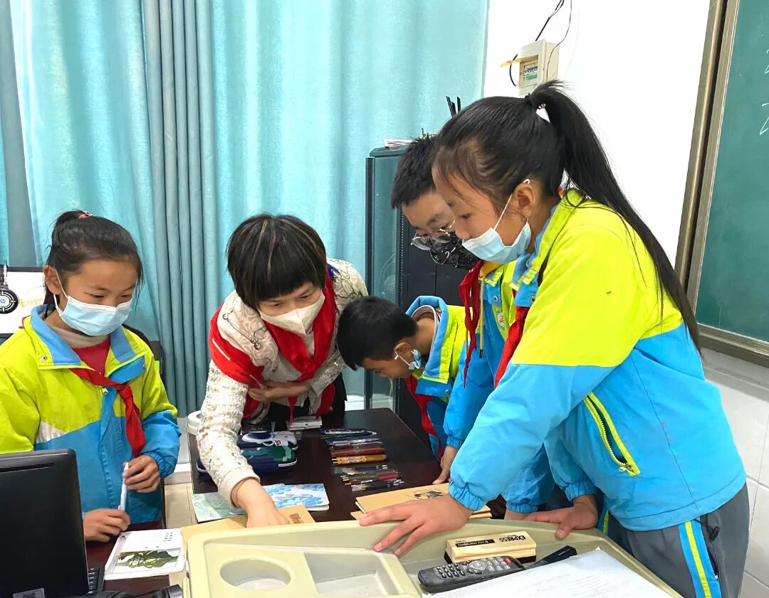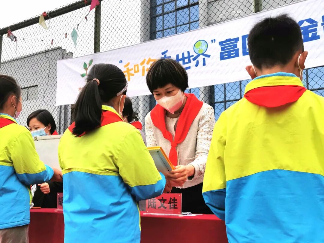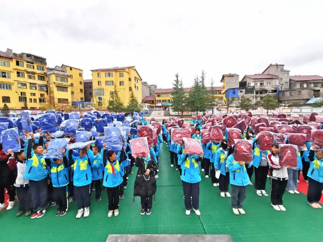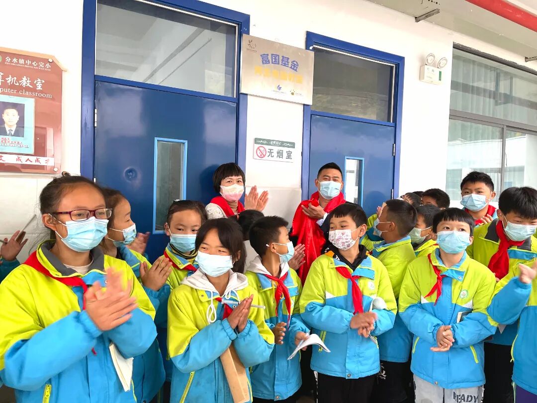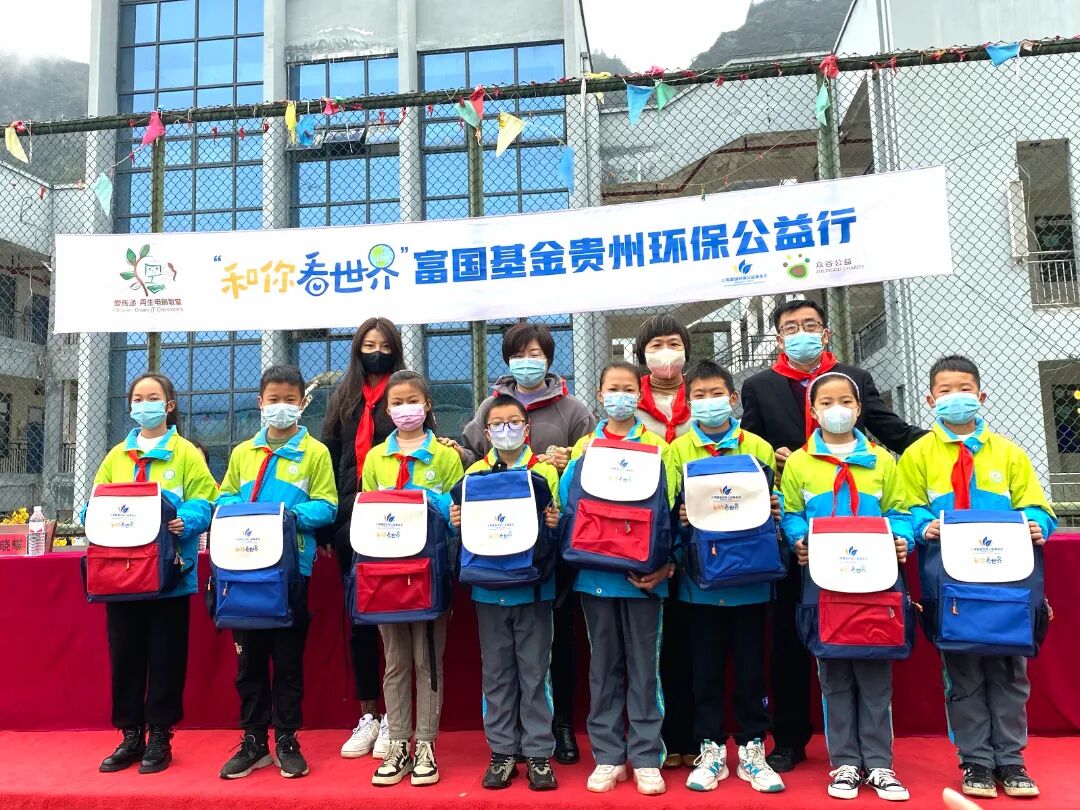 富国环保公益基金会领导和志愿者为分水镇中心完小学生捐赠书包
