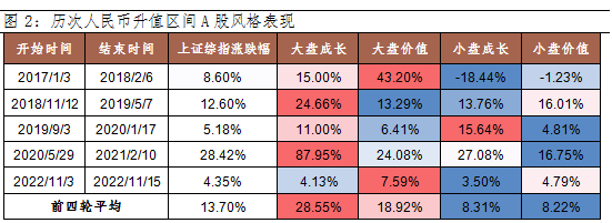 回顾2015年“811”汇改至今四轮人民币升值区间,A股均走出上升行情,平均涨幅13.7%。一方面,人民币升值期间,北上资金流入带来增量资金;另一方面,人民币升值多对应国内基本面向好,投资者情绪较为乐观。 从风格来看,大盘成长和大盘价值表现占优,平均涨幅高于上证综指涨幅,小盘成长和小盘价值表现弱于A股整体,总体上大盘成长>大盘价值>小盘成长>小盘价值。 当前阶段,随着国内“稳增长”政策加码和防疫政策优化,大金融板块率先迎来上涨,推升大盘价值行情,后续风格切换还需等待政策效果的验证。