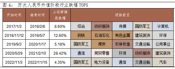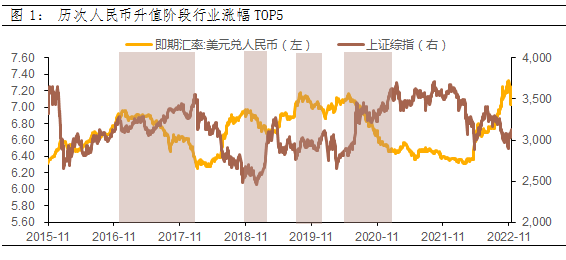 11月3日美联储会议后美元指数不断下跌,美国10月CPI数据和PPI数据增速均回落且低于预期值,通胀数据超预期回落推动美元指数进一步下挫。截至11月15日,美元指数区间跌幅达5.68%。美元指数持续下跌,人民币贬值压力缓解。从11月3日至今,美元兑人民币汇率已大幅下跌3.9%,接连收复7.30、7.20、7.10整数关口至7.03一线。 回顾历史上人民币升值阶段,哪些板块配置价值更高?当前人民币汇率是阶段性反弹还是趋势性拐点?