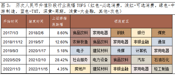 在本轮人民币升值区间,房地产、建筑材料、非银金融受益于“稳增长”政策加码基本面预期改善,北上资金加速流入大金融板块,金融地产板块强势领涨。未来如果疫情出现明显好转,消费板块的配置机会亦值得关注。