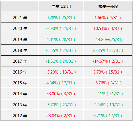 级掌柜做了一组数据统计发现,在过去十年,大多数的12月份,银行板块整体的表现都不算优秀,大多数处于后半段或者吊车尾的位置;但在十年的数据中,在6年均出现了反转效应,如由坏转好的2021、2020、2017、2015等,由好转坏的2014、2012等,或许由于在岁末年初,市场上的投资组合的调仓或风格切换引起。