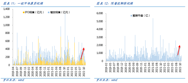 资金需求方面,本周一级市场规模有所减少,限售股解禁压力下行,重要股东减持。本周一级市场资金募集金额合计95.45亿元,较上周减少33.12%;结构上,IPO募集65.80亿元,周环比减少23.60% ;增发募集29.66亿,周环比减少47.61% 。本周限售股解禁规模合计744.45亿元,周环比增加24.44% ,根据目前披露的数据,预计下周解禁规模约678.12亿元,解禁压力有所上行。本周重要股东减持66.33亿元,上周增持27.16亿元。