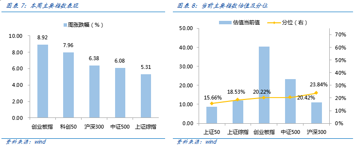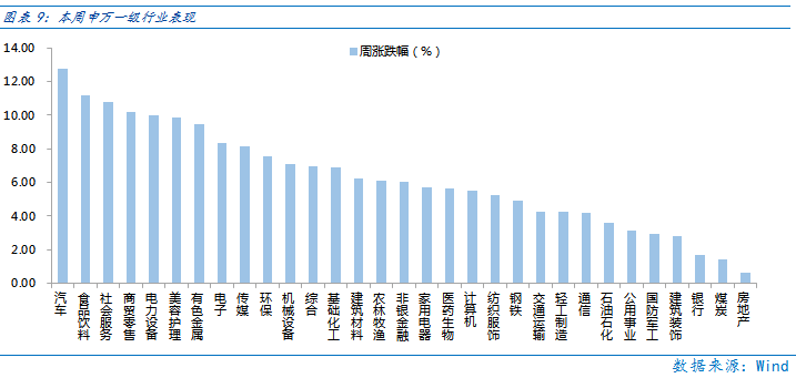 近一周,上证指数上涨5.31%,创业板指上涨8.92%,沪深300上涨6.38%,中证500上涨6.08%,科创50上涨7.96%。风格上,成长、消费表现相对较好,稳定、金融表现较差。从申万一级行业看,表现相对靠前的是汽车(12.74%)、食品饮料(11.18%)、社会服务(10.78%)、商贸零售(10.15%)、电力设备(9.99%);表现相对靠后的是房地产(0.61%)、煤炭(1.41%)、银行(1.68%)、建筑装饰(2.83%)、国防军工(2.96%)。