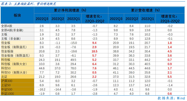 三季报披露完毕,“业绩雷”风险在上周释放,经济底在二季度,上市公司业绩底在三季度,盈利见底后,业绩对市场的“掣肘”在弱化。除创业板指和科创50指数外,宽基指数净利润增速均较二季度放缓,显示经济“二次回落”对企业盈利确实形成冲击,但季报披露完毕,市场通过10月的下跌消化了“业绩雷”的冲击后,未来市场反而可以“轻装上阵”。