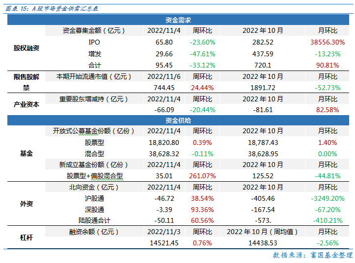 资金供给方面,本周基金发行增加,北向资金净增加。本周北向资金净流出50.11亿元,较上周增加60.56% ,其中沪股通净流出46.72亿元,深股通净流出3.39亿元。本周新成立股票型及偏股混合型基金份额合计35.01亿份,环比增加261.07% ,显示基金发行火热。本周开放式公募基金份额较稳定,其中股票型份额几乎保持不变为18820.80亿份,混合型份额几乎保持不变为38628.32亿份。