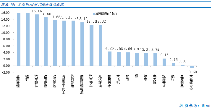资源“自主可控”时代到来,有色金属行业走强。“安全”是近期A股最重要的主题投资方向,本周加拿大限制中资企业对矿业的股权收购,使得市场今日为资源领域“自主可控”的重要性定价,锂矿板块迅速走强。从Wind热门概念板块来看,表现相对靠前的是盐湖提锂(19.62%)、锂矿(17.96%)、汽车配件(15.46%)、锂电正极(14.56%)、动力电池(13.68%);表现相对靠后的是大基建央企(-0.6%)、血液制品(0.31%)、银行(0.75%)、煤炭开采(2.16%)、电力股(3.74%)。