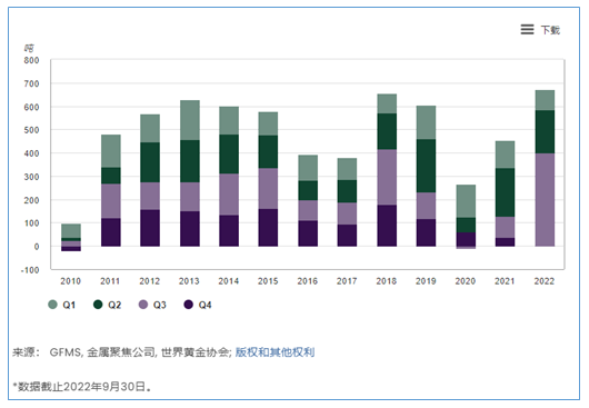 图:年初至今净购买量达到673吨,超过了1967年以来的所有年度总量