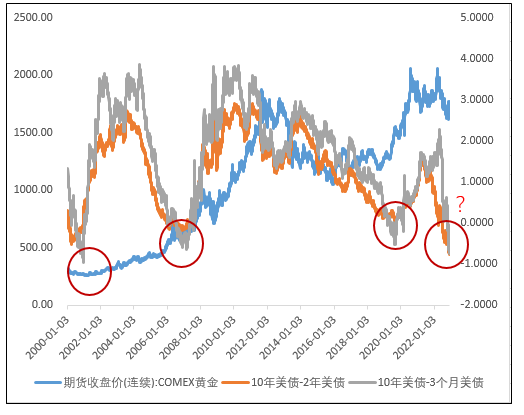 此外,从美债期限利差来看,当前无论10年美债和2年美债或者3个月美债收益率倒挂都在历史低点,如果利差开始收敛,黄金或会迎来一波不错的反弹。