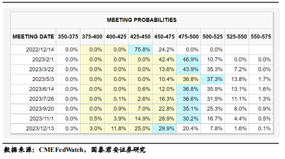 图:联邦基金利率期货市场反映12 月大概率加息50BP,终点利率在5.1%左右