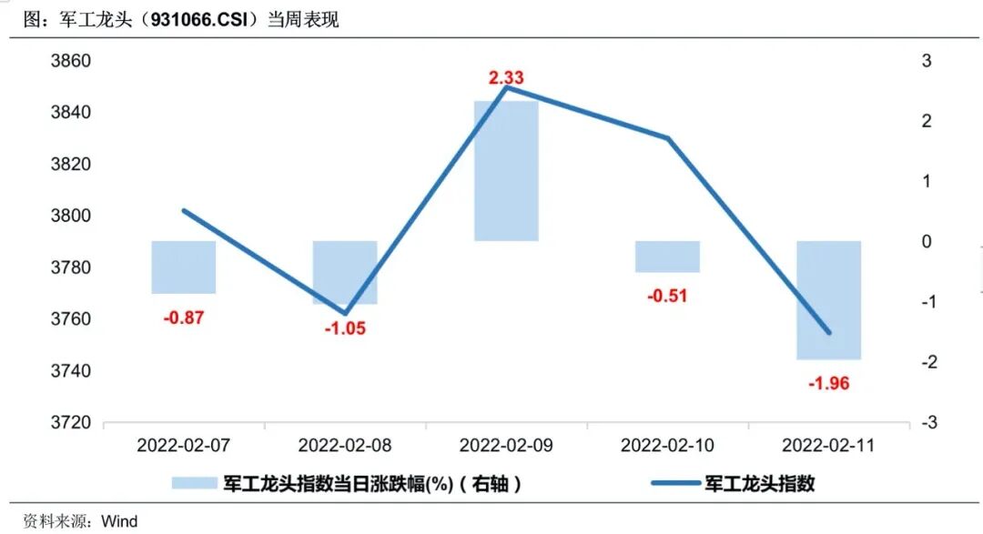 上周军工龙头指数总体下行,全周涨跌幅为-2.07%。其中,周三上涨,涨幅为2.33%,周一、周二、周四、周五下跌,跌幅分别为-0.87%、-1.05%、-0.51%、-1.96%;收于3754.60。