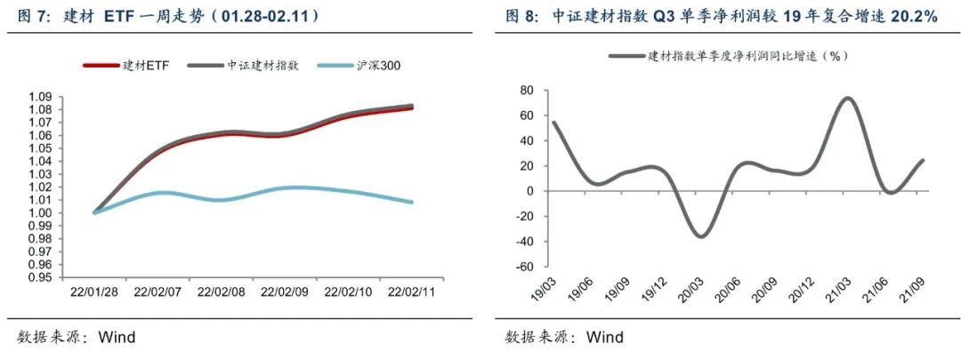 上周中证建材指数的收益率8.3%,跑赢沪深3000.8%;中证建材指数整体行情波动大于沪深300。中证建材指数年初至今的收益率为1.7%,跑赢沪深300-6.9%