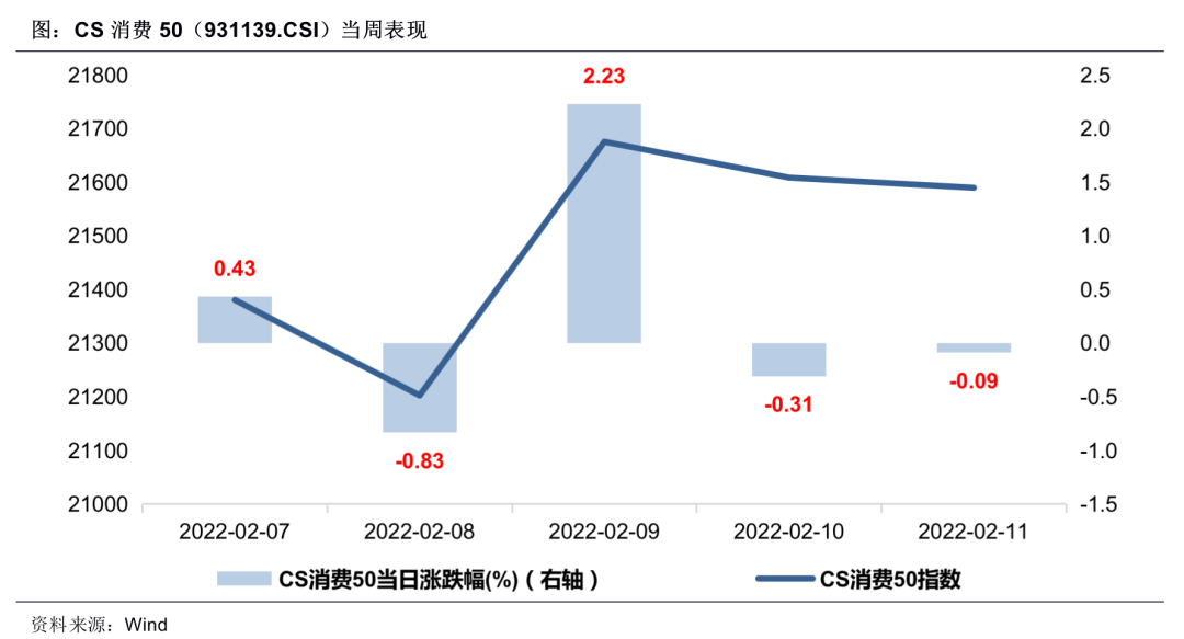 上周CS消费50指数周一小幅上涨,周二下跌,周三大幅上涨,周四、周五小幅回调,全周累计上涨1.44%,相较沪深300指数跑赢0.59%。