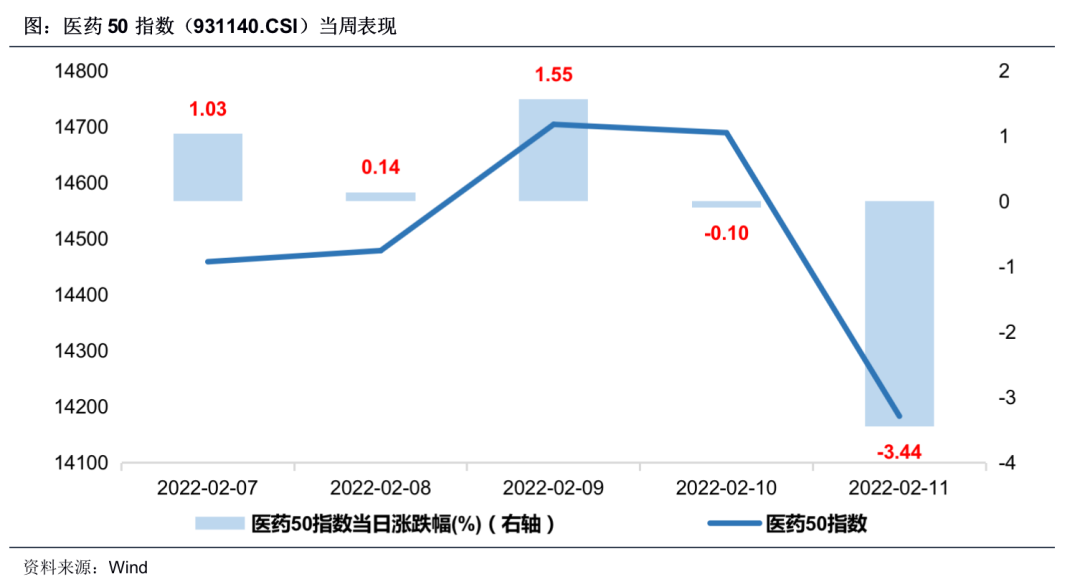 2月7日至2月11日,医药50指数(931140.CSI)表现有所回升,但在小幅上升后周五出现显著下跌,跌幅为-3.44%,截至周五收盘指数单周累计下跌0.82%,跑输沪深300指数1.66个百分点。