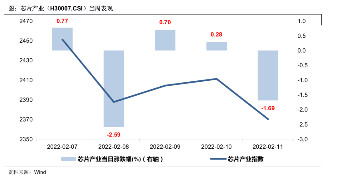 上周芯片产业指数周一小幅上涨,周二大幅下跌,周三、周四小幅回调,周五延续跌势,全周累计下跌2.53%,相较沪深300指数跑输3.37%。