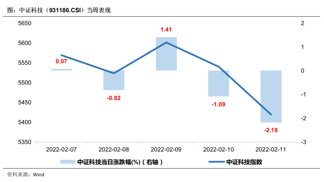 上周中证科技指数总体下行,全周涨跌幅为-2.61%。其中,周一、周三上涨,涨幅分别为0.07%、1.41%,周二、周四、周五下跌,跌幅分别为-0.82%、-1.09%、-2.18%;收于5419.26。