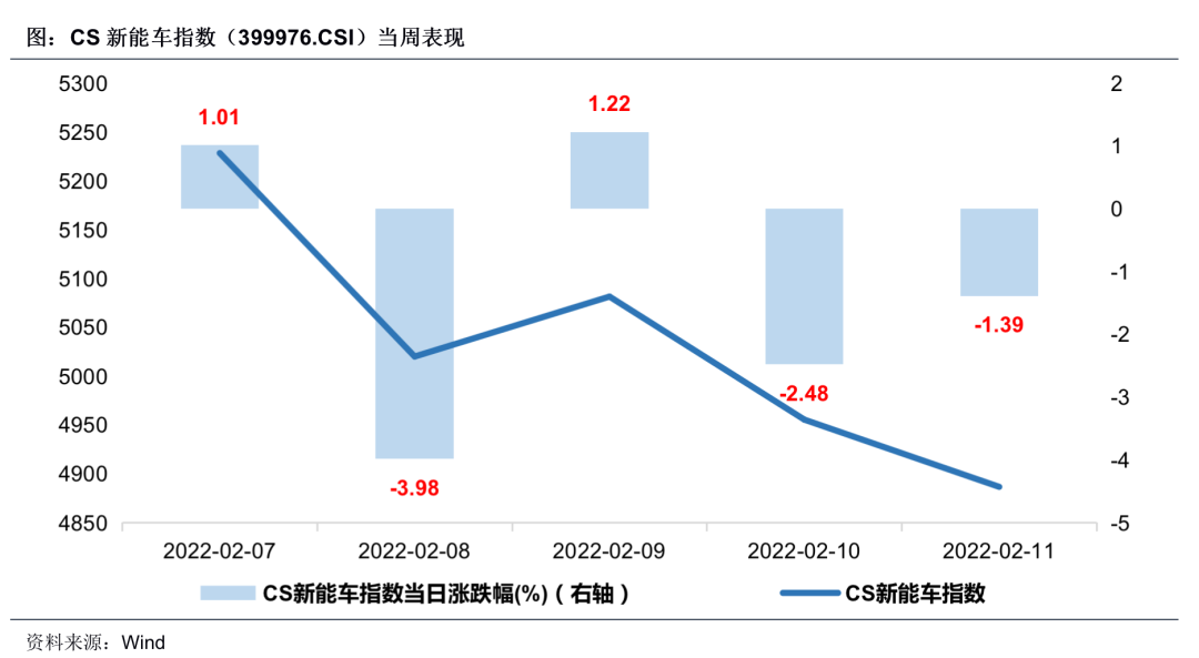 上周市场风格分化进一步加剧,稳增长板块表现突出,成长板块再次回调,其中CS新能车指数(399976.SZ)全周(2.7-2.11)下跌5.59%。上周,随着新能源汽车板块的进一步下跌,特别是个别电池龙头企业的大幅调整,各种负面传闻不绝于耳,引发市场对新能源车行业基本面的担忧加大。周末,相关公司已发布澄清说明,并表明将依法维护自身正当权益。上周新能源汽车板块的调整,主要还是受到市场风格的影响,除新能源车外,新能源、智能汽车、军工、TMT、生物医药等成长板块总体均表现较弱。从基本面来看,根据近期车企陆续发布的1月新能源汽车销量显示,1月新能源汽车销量总体来看呈现淡季不淡的特征。从全年来看,新能源汽车销量快速增长的趋势仍较为明确,特别是美国市场目前新能源车渗透率较低,2022年增长有望进一步加速。