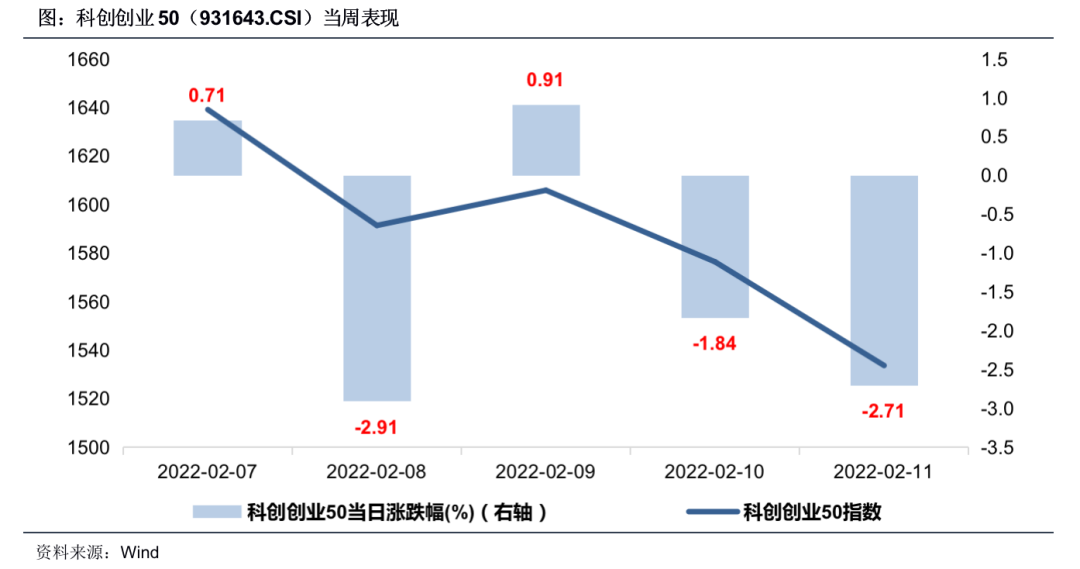 上周科创创业50指数在周一上涨后连跌四天。全周累计下跌5.84%,相较沪深300指数跑输6.68%。