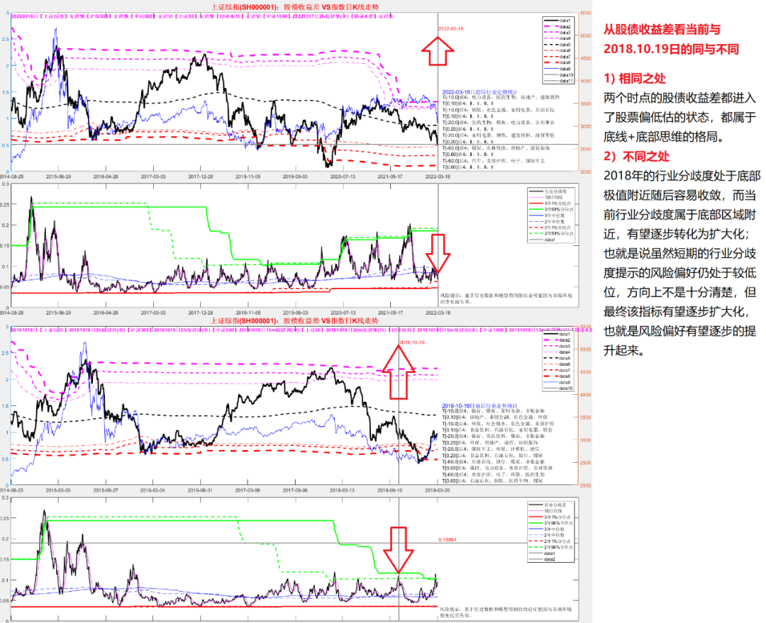 当然,最简单易懂的分析思路是借鉴历史。如果一定要用历史情境类比,从各个维度来看,最合适的情境或可参考2018年10月中下旬。不过在八哥跟踪的指标体系中,当下与那时最大的区别在于行业分歧度状态不一样,那时的行业分歧度有从极值高点回落的需求(对应着风险偏好下行),而当下有从极值低点震荡往上(对应这风险偏好逐步上行)的可能性。