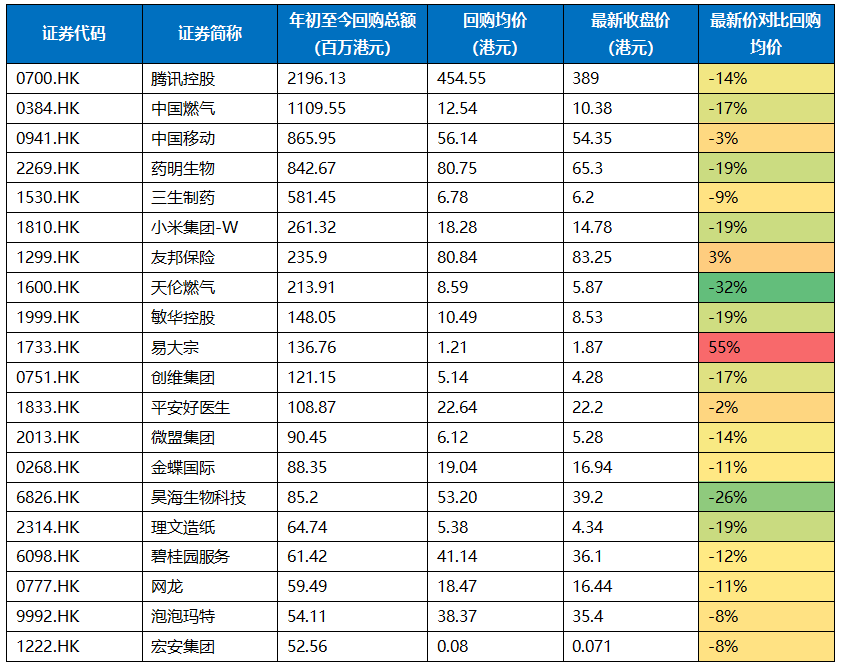 级掌柜统计了今年以来,港股回购总金额排名靠前的二十大公司,发现大部分公司最新收盘价仍低于回购均价(其中也包括多只港股通互联网的成分股)。
