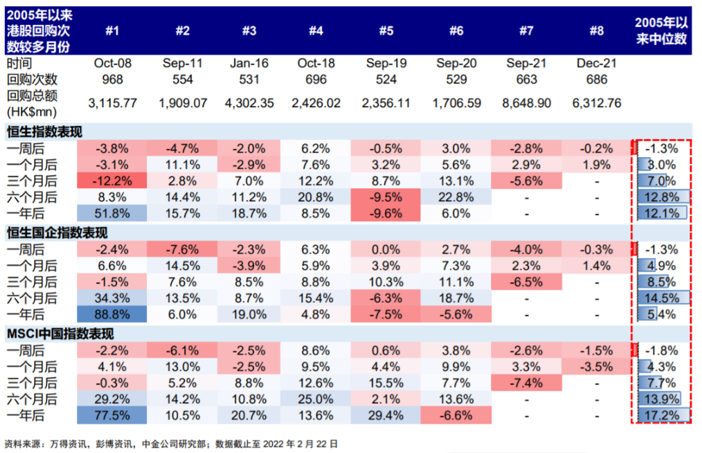 中金策略统计了2005年以来港股回购次数较多的月份,以及后续港股表现。发现: