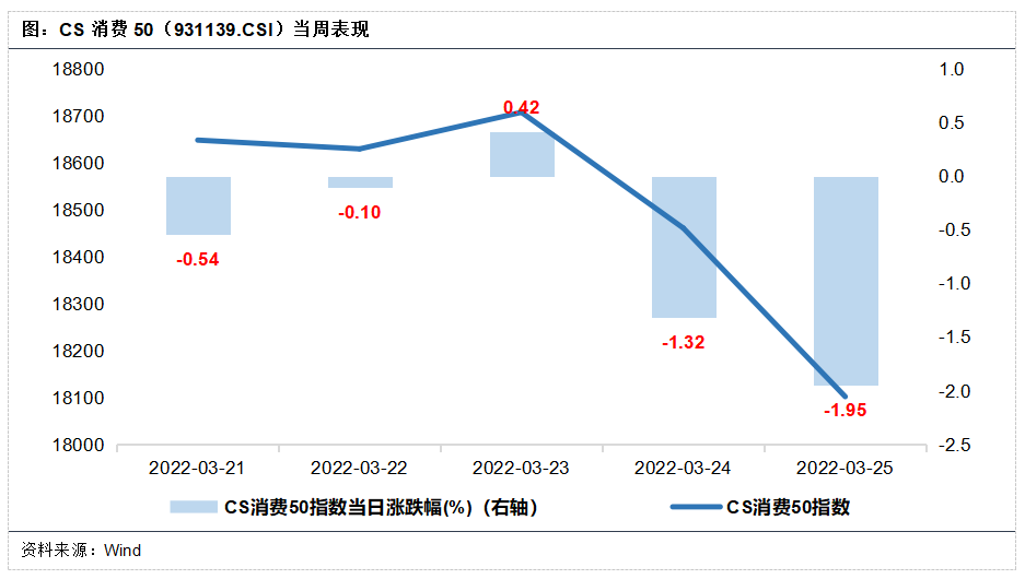 上周CS消费50指数周一、二、三小幅震荡,周四、五大幅下跌,全周累计下跌3.49%,相较沪深300指数跑输1.35%。
