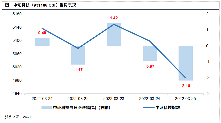 上周中证科技指数总体下行,全周涨跌幅为-2.41%。其中,周一、周三上涨,涨幅分别为0.49%、1.42%,周二、周四、周五下跌,跌幅分别为-1.17%、-0.97%、-2.18%;收于4987.43。