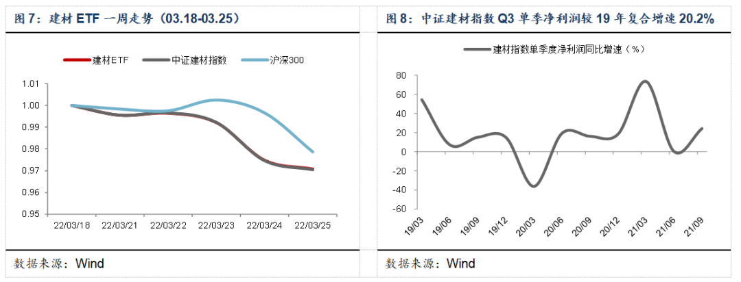 上周中证建材指数的收益率-3.0%,小幅跑输沪深300的-2.1%;中证建材指数整体行情波动大于沪深300。中证建材指数年初至今的收益率为-12.8%,跑赢沪深300的-15.5%。