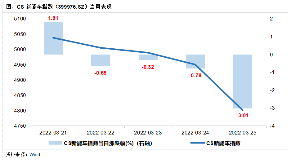 上周,新能源汽车板块总体冲高回落,其中中证新能源汽车指数(399976.SZ)全周(3.21-3.25)下跌2.97%。上周各新能源汽车品牌陆续提价,以应对补贴退坡和碳酸锂价格高企的影响。近期受疫情扩散影响,部分地区管控加强,一些车企排产、供应链采购及终端零售等均受到一定程度的影响,同时叠加部分车型陆续涨价,因此市场担心新能源车销量会受到较大的影响。从短期来看,疫情的扩散的确会影响部分车企的生产和销售,但从中期来看,一些强势品牌主力车型的新增订单并未受影响,且持续高企的油价会进一步强化电动车使用经济性。短期受疫情影响,销量可能会有所波动,但需求并不会消失,一旦疫情好转,需求仍然会得到释放,类似2021年8、9月份的情况。