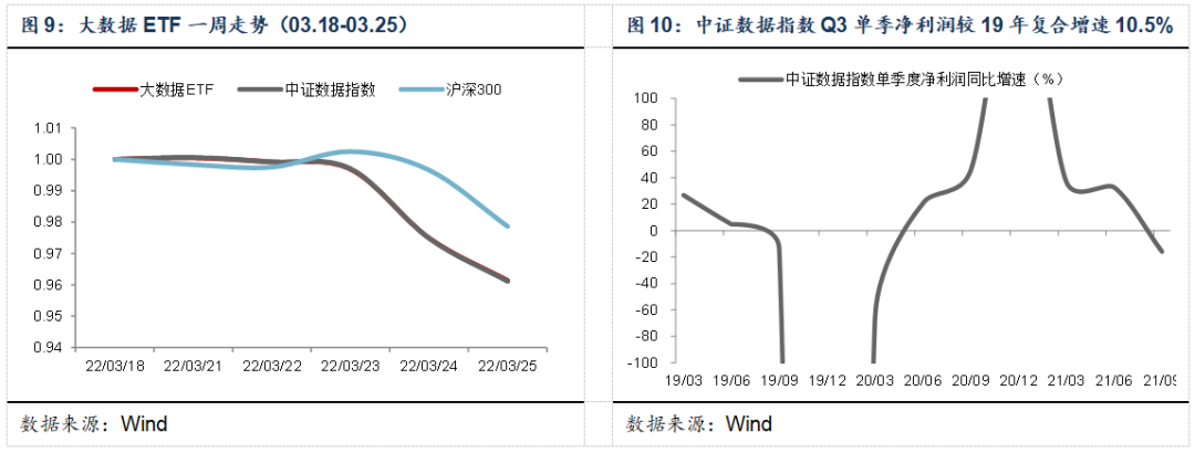 上周中证数据指数的收益率-3.9%,跑输沪深300的-2.1%;中证数据指数整体行情波动大于沪深300。中证数据指数年初至今的收益率为-19.5%,跑输沪深300的-15.5%。
